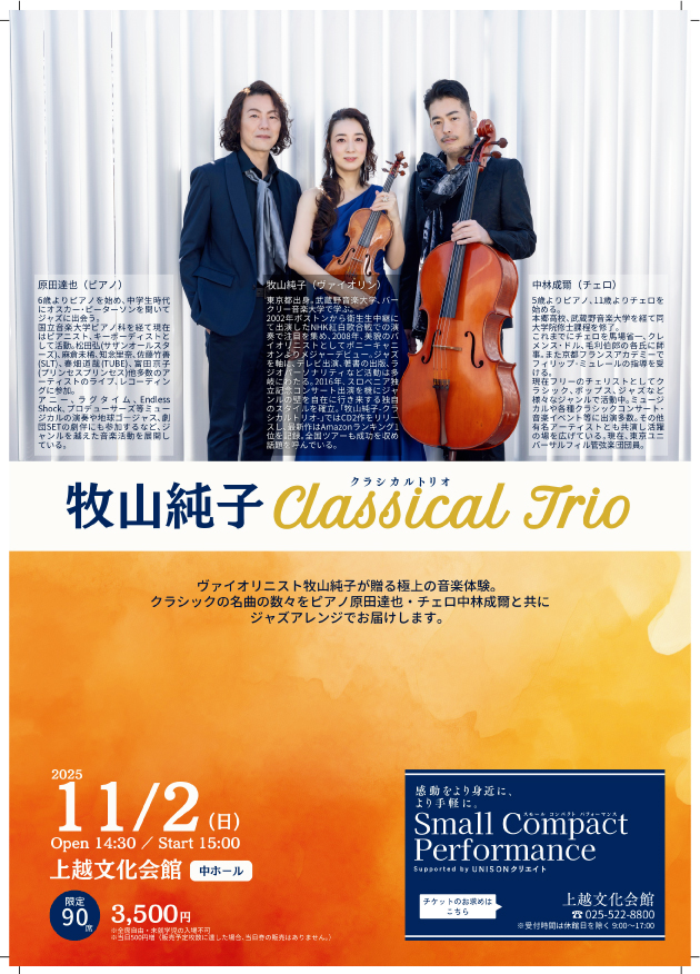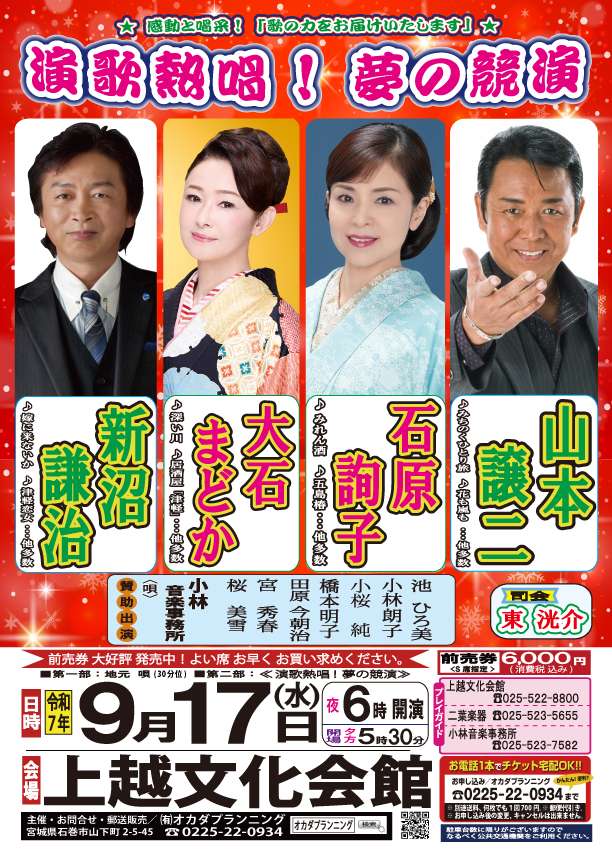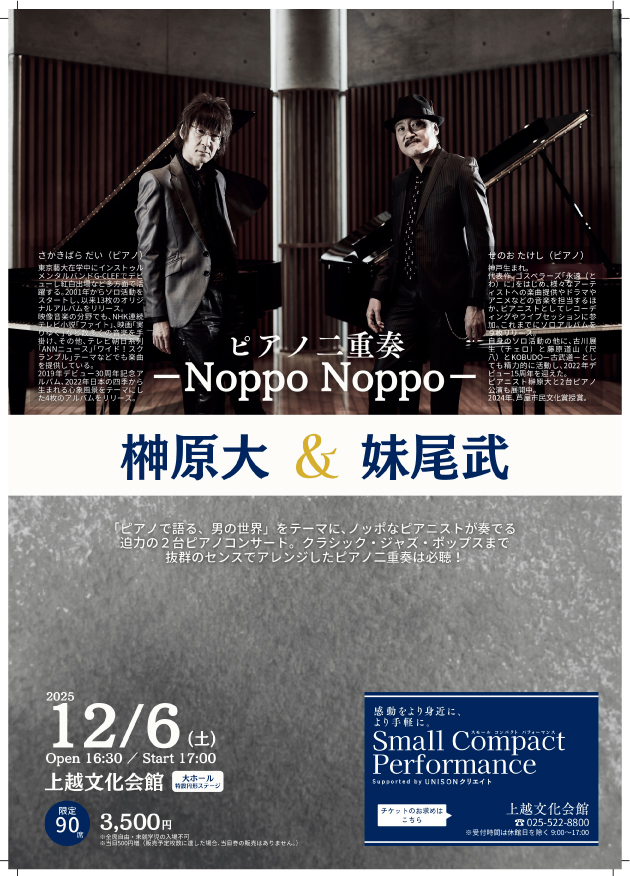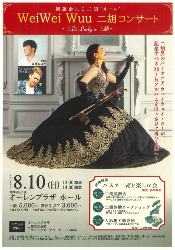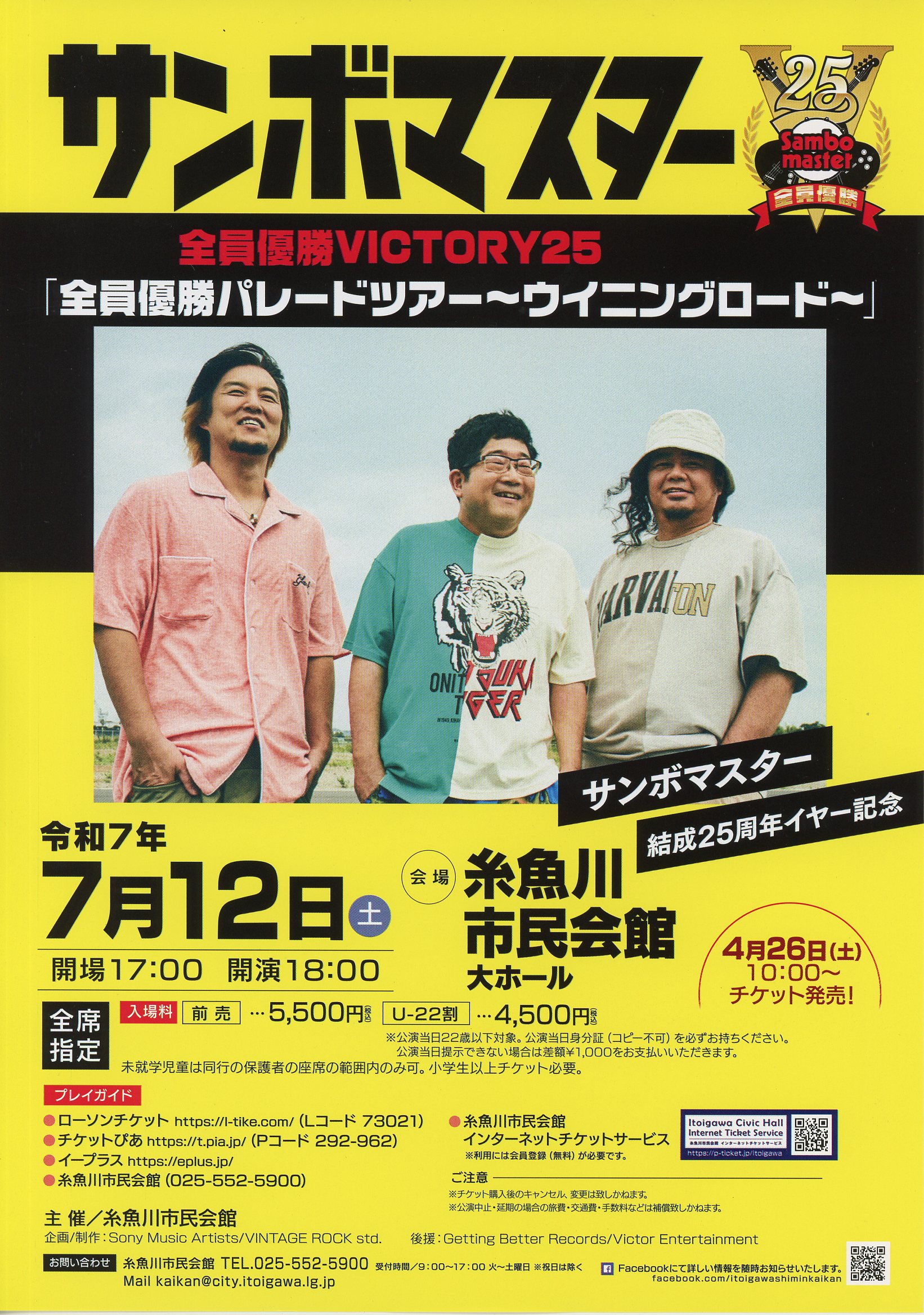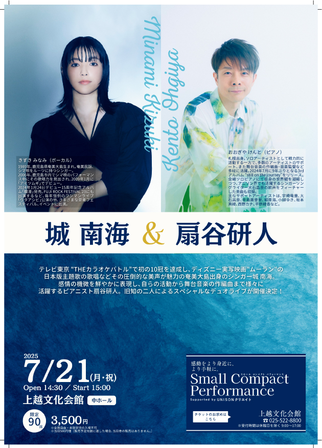 日時 2025/11/22 (土) 開場17:00 開演18:00 会場 上越文化会館 チケット代金 全席指定席 ¥8,800(税込) 車椅子席 ¥8,800(税込) 年齢制限 未就学児入場不可 先行予約情報