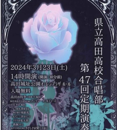 Read more開場:午後1時30分 開演:午後2時 入場料:無料 会場:高田城址公園オーレンプラザホール 曲目 「高田の四季」(後藤丹編曲) 無伴奏混声合唱のための「アニソン・オールディーズ」(信長貴富編曲) にっぽん昔ばなし ゆけゆ