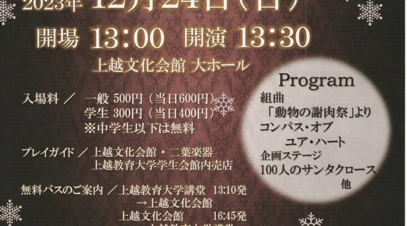 Read more上越教育大学吹奏楽団の演奏会です。皆さんに楽しんでいただける内容でおおくりします。 日付/12月24日 (日) 開場 13:00 開演 13:30 場所/上越文化会館 大ホール 曲目/組曲「動物の謝肉祭」 コンパス・オ