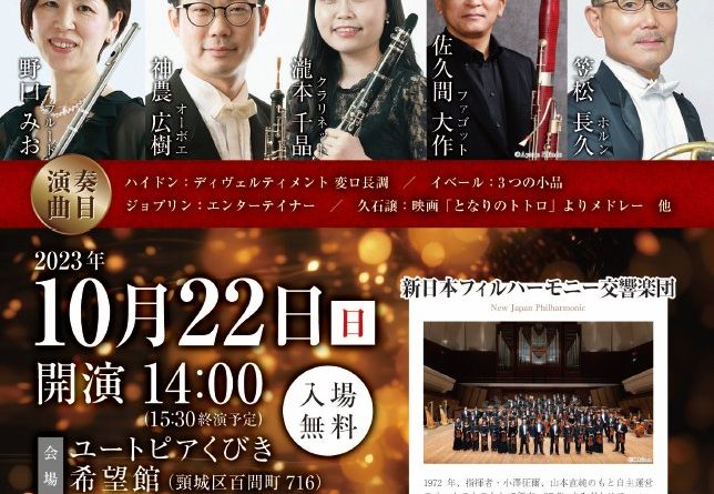Read more新潟県上越市 の「ユートピアくびき希望館」で新日本フィルメンバーによる木管五重奏のコンサートがあります。 📅10/22(日)14時~ 入場は無料ですが入場券が必要です。詳細はこちら👇 新日本フィルハーモニー交響楽団メンバ