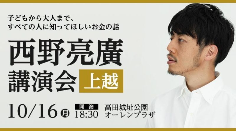 Read moreキングコング西野亮廣さんの講演会を新潟県上越市で開催!! 国内外で大活躍する芸人・絵本作家の西野亮廣さんによる講演会が新潟県上越市にて開催されます。 『親子で学ぶ、お金の話』をテーマにこれからの時代の夢とお金について、そ