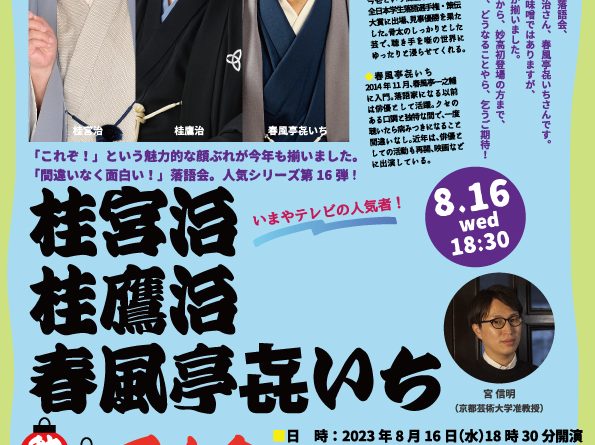 Read more「これぞ!」という魅力的な顔ぶれが今年も揃いました。爆笑トークも好評の宮先生が精選する注目の芸人さんによる「間違いなく面白い!」落語会。人気シリーズ第16弾は、いまやテレビの人気者、お馴染みの宮治さんが真夏の夜に登場。さ