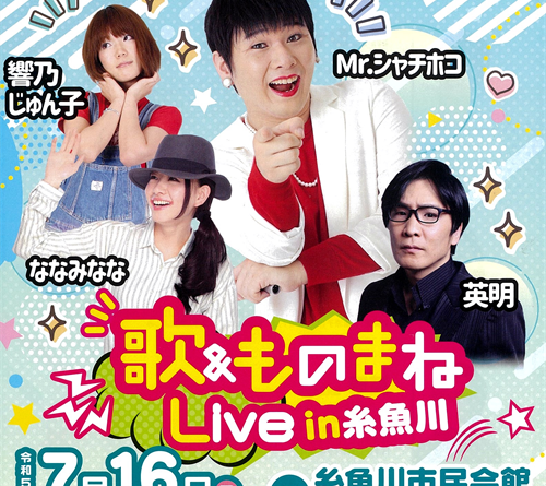Read moreMr.シャチホコ×ななみなな×英明×響乃じゅん子 歌&ものまねLive in 糸魚川全席指定 前売 一般 3,500円(当日500円増) 前売 子ども(高校生以下)/シニア(65歳以上) 2,500円(当日500円増)
