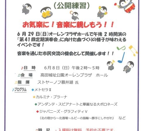Read moreお気楽に!音楽に親しもう! 6月29日(日曜日)オーレンプラザホールで午後2時開演の「第41回定期演奏会」に向けた曲づくりの様子が味わえるイベントです! 音楽を通じた市民交流の機会として開催します! 開催時間:午