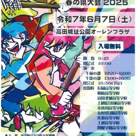 Read more新潟県内の高等学校による「軽音楽春の県大会2025」を開催します。 開場:午前9時45分 開会式:午前10時 演奏:午前の部・午前10時20分から正午、午後の部・午後1時から4時30分 閉会式:午後4時50分(予定) 入