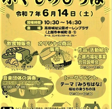 Read more開催時間:午前10時30分から午後2時30分 会場:高田城址公園オーレンプラザ ホール、エントランス、ロビー 主催:ふくしのひろば実行委員会 加盟施設:つばき工房、居多さくら工房、北さくら工房、南さくら工房、さくら工房、