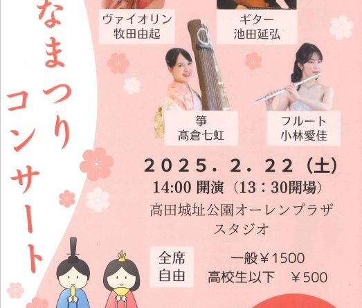 Read more上越地域の演奏家によるコンサートです。 場所/高田城址公園オーレンプラザ スタジオ 日時/2月22日 午後1時30分開場 午後2時開演 入場料/一般1,500円、高校生以下500円 全席自由 主催・問合せ/ふれあいコンサ