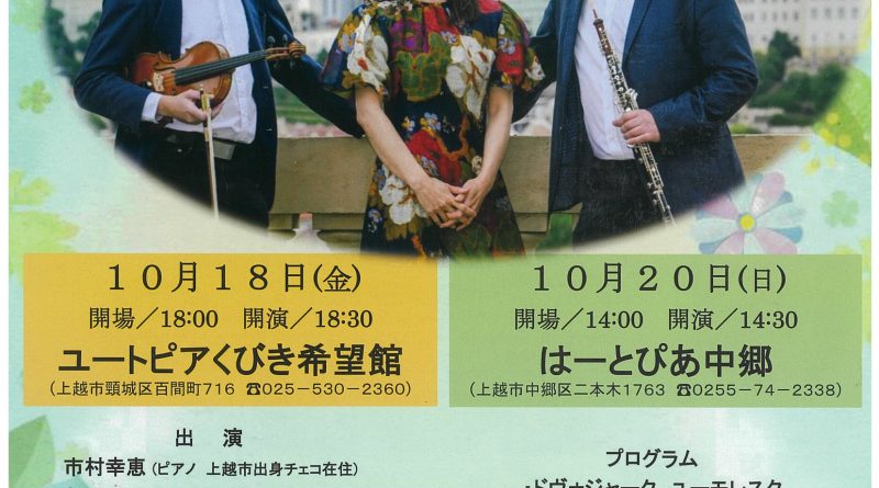 Read moreチェコ共和国トップ奏者を招いての文化交流 公演概要 開催日 2024/10/18(金)、20(日) 演目 出演 市村幸恵(Pf) ヤン トゥーリ(Ob) ヴィクトル マザーチェク(Vi) プログラム ・ドヴォルジャーク