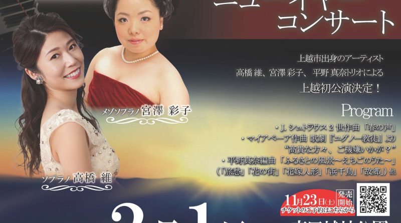 Read more上越市出身のアーティスト 高橋 唯、宮澤 彩子、平野 真奈トリオによる上越初公演決定! 公演概要 開催日 2025/2/1(土) 演目 出演 高橋 維(ソプラノ) 宮澤 彩子(メゾソプラノ) 平野 真奈(作曲・編曲・ピア
