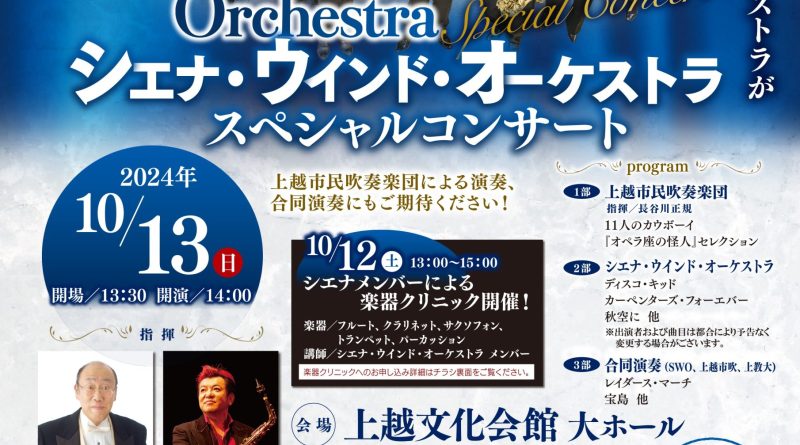 Read more豪華二名の指揮者によるプログラム! 上越市民吹奏楽団による演奏、合同演奏にもご期待下さい! 演目 1部 上越市民吹奏楽団 指揮/長谷川 正規 2部 シエナ・ウインド・オーケストラ 指揮/青島 広志 オリタ ノボッタ 3部