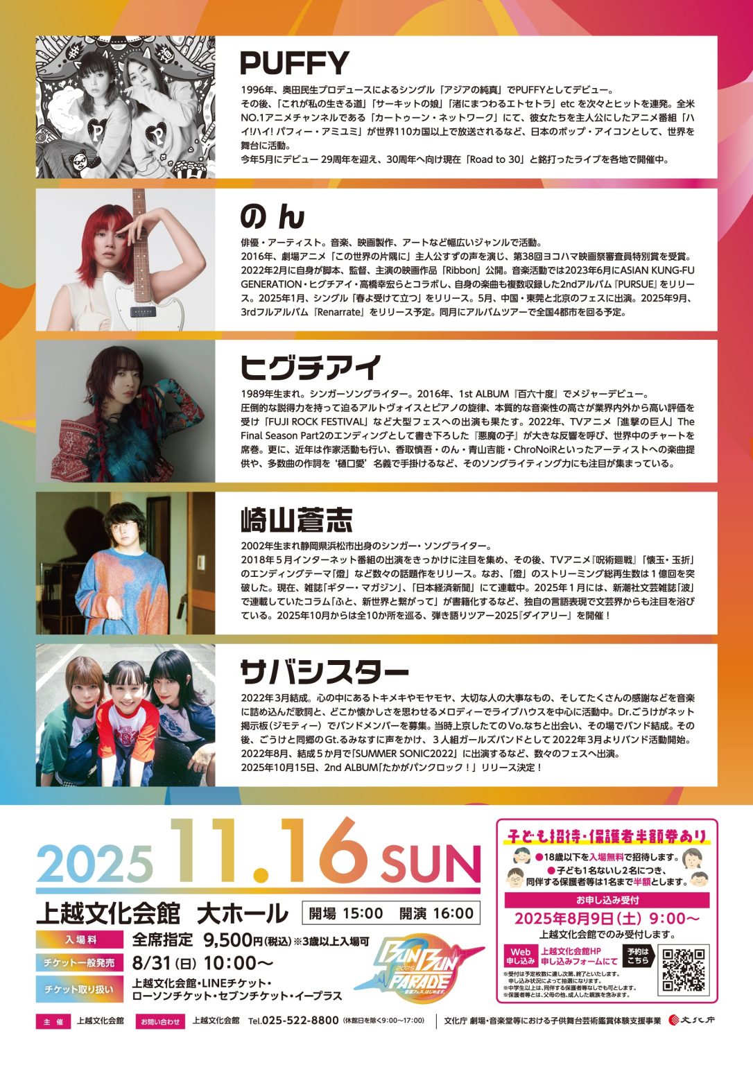 一歩足を踏み入れた瞬間から胸を躍らせ、心も身体も熱くなるエネルギーと希望が溢れている音楽フェス。・・・2025年秋!日本の音楽シーン、ライブシーンの第一線で活躍するアーティストが上越に集結!フェスの幸福感・満腹感を、この上越市でご体感ください!!!